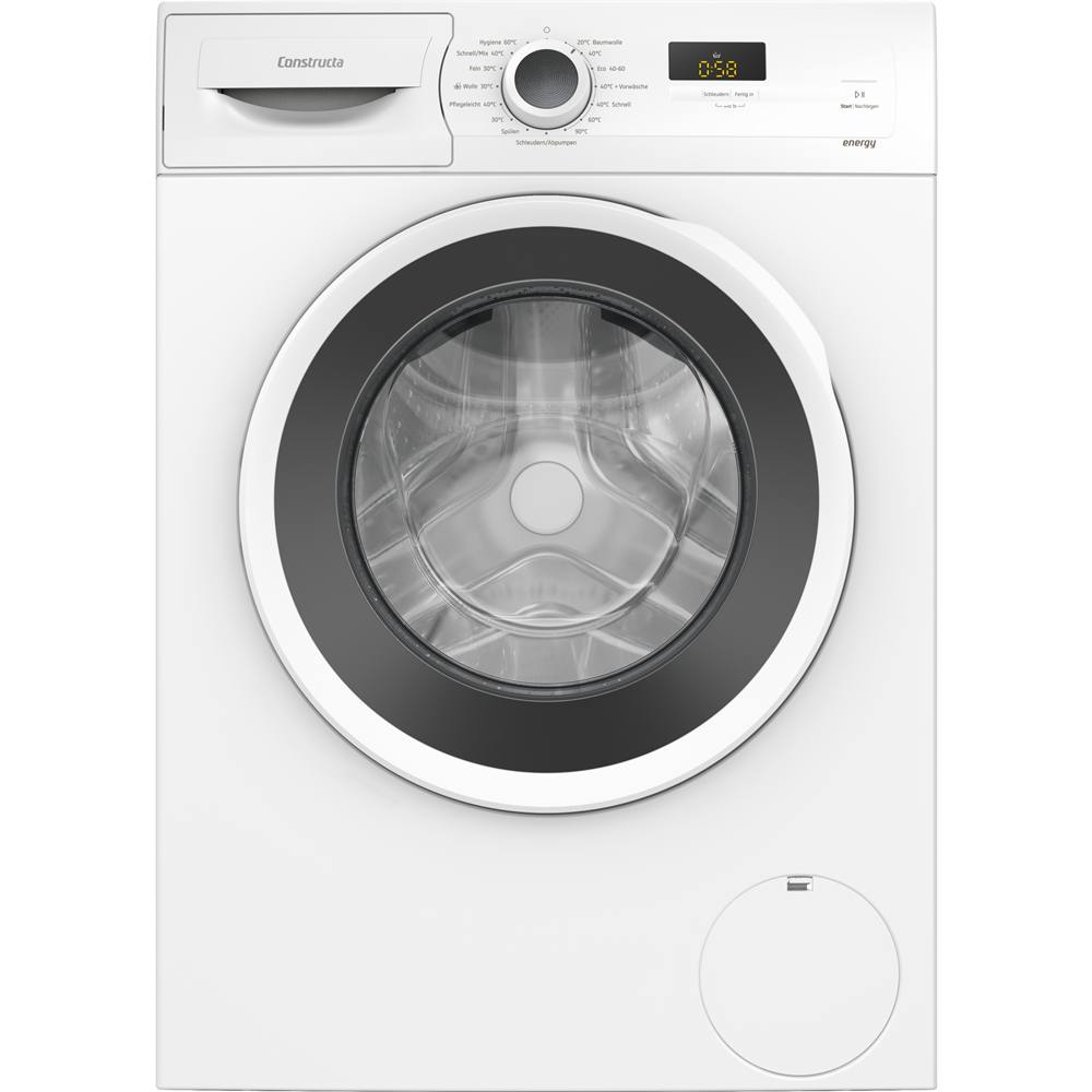Weiße Waschmaschine von Constructa mit runder Tür. Bedienfeld oben rechts, digitales Display zeigt „0:50“.