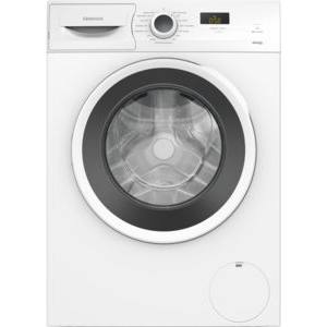 Weiße Frontlader-Waschmaschine mit rundem, schwarzem Bullauge. Bedienfeld oben rechts mit digitalen Anzeigen und Drehknopf.